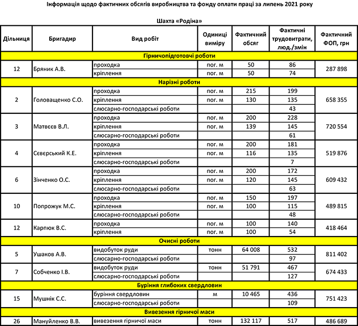 Пропонуємо вашій увазі офіційну інформацію щодо фактичних обсягів виробництва та фактичного фонду оплати праці за липень 2021 року дільниць шахт та ШБУ. Відзначаємо, що розмір заробітної плати безпосередньо залежить від виконання планових виробничих показників.
